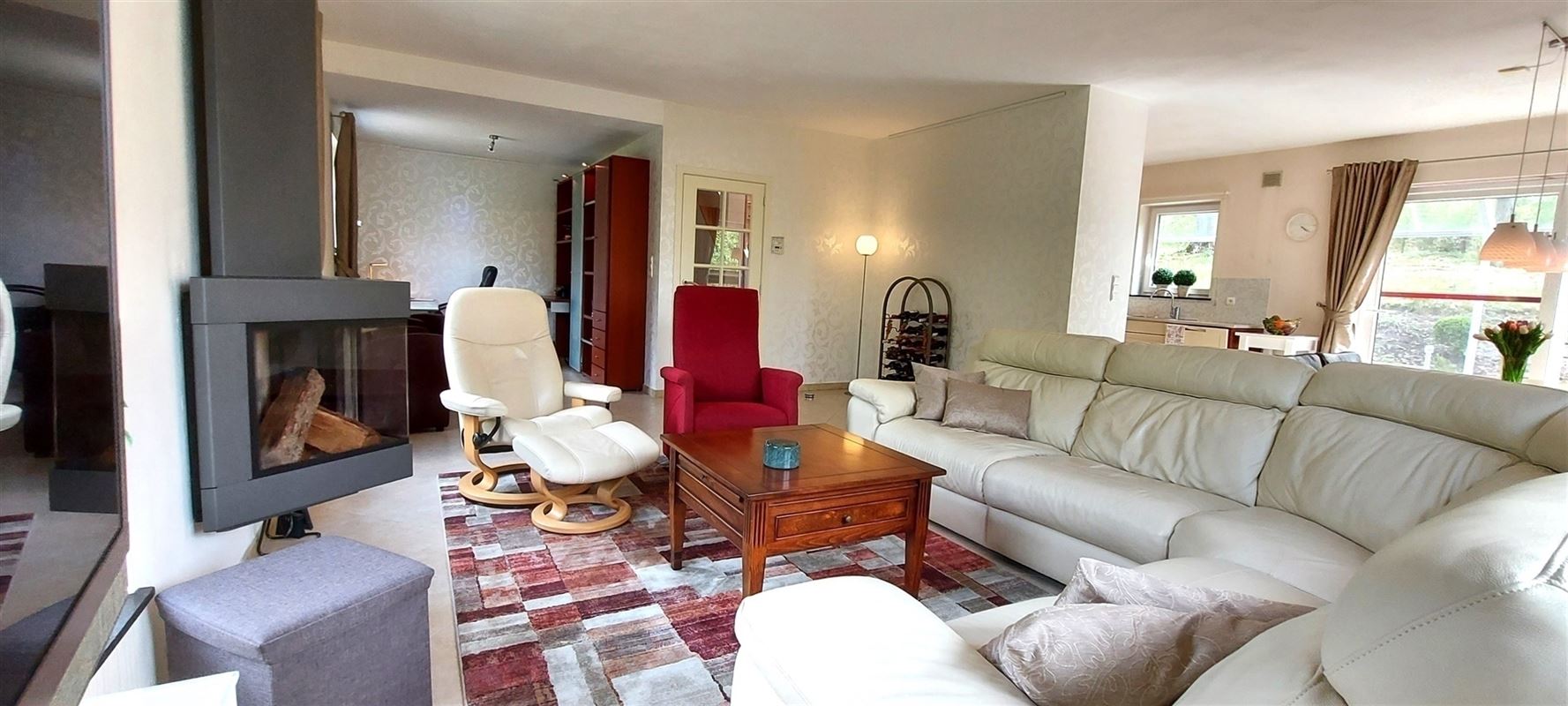 Extra’s: Ruime ruimtes, vloerverwarming, haardkachel (Trias van Leenders), gunstige EPC, insektenhorren, voorziening Proximus of satelliet, regenwater, individueel zuiveringsstation, waterontkalker, alle voorzieningen voor vast verblijf, wasmachine, droogkast, … Garage voor caravan of mobilhome, poort met afstandsbediening.