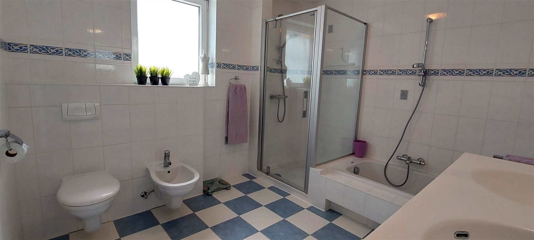 2de verdieping: Twee slaapkamers. Badkamer met douche, 2 lavabo’s. Aparte w.c..