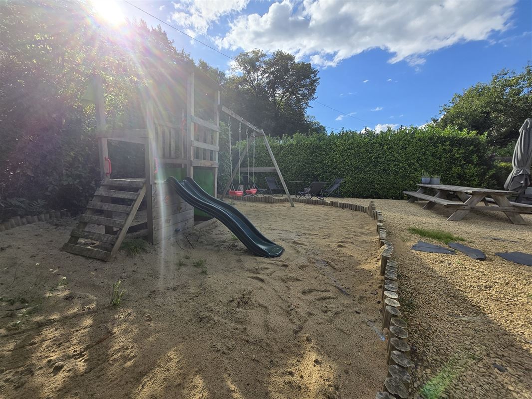 Tuin: aparte garage, terras, idyllische tuin met waterpartij en speeltuigen, zonneterras. Volledig omheind met hek.